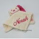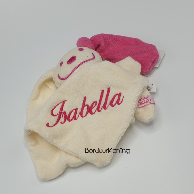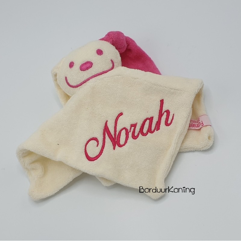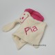 Tutpoppetje ecru doekje (24 x 24 cm), één oortje is fuchsia van kleur.