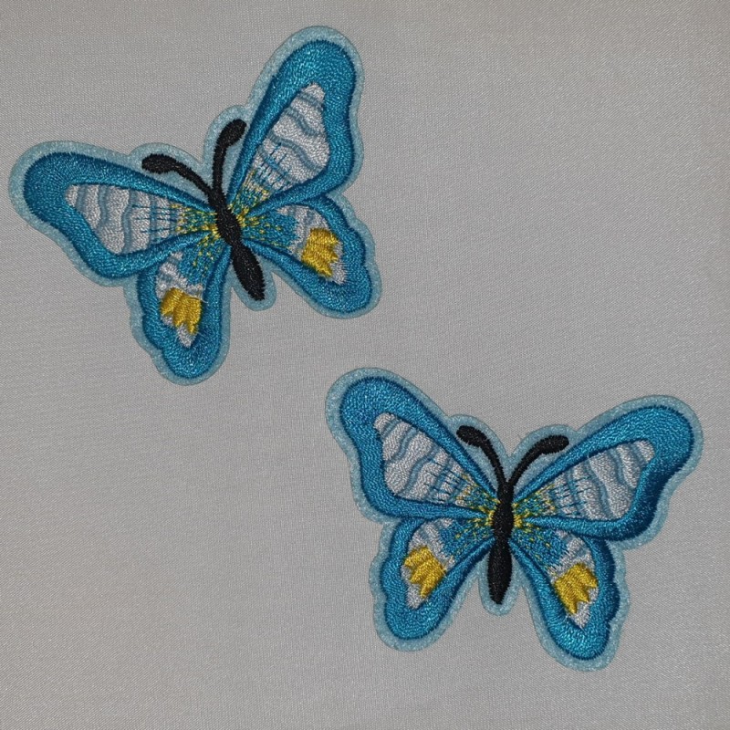 Applicatie vlinder blauw 2 stuks. Kleuren zwart, blauw, wit en geel