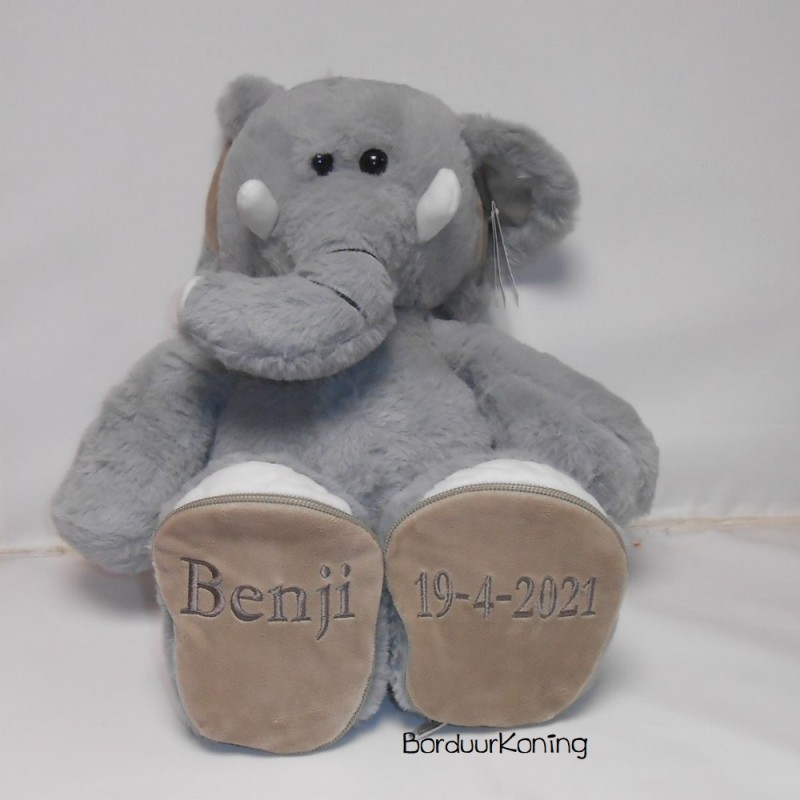 Hij heeft grijze/taupe voetjes waar op geborduurd kan worden.